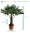 De Trachycarpus fortunei is een winterharde palmboom. De palm geeft een fantastische indruk met zijn ruige, vezelige bast en waaiervormige bladeren. De stam is in het algemeen wat dunner aan de onderkant en wat dikker aan de bovenkant. Trachycarpus fortunei zal ongeveer 10 - 12 meter hoog worden.